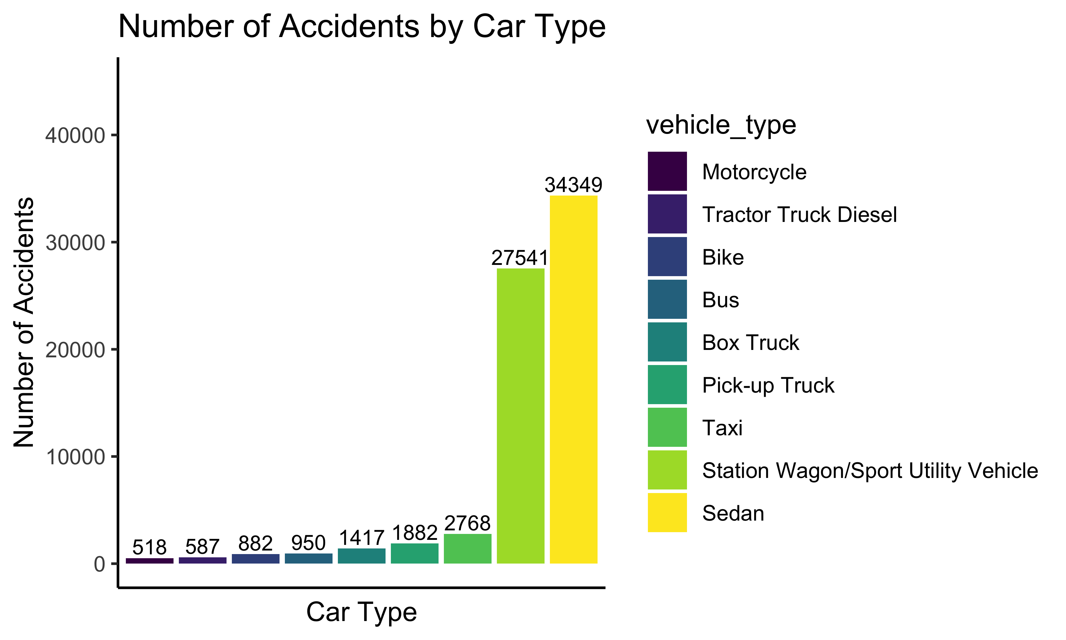 Then, we want to know how types of cars are associated with the number of accidents. A bar plot of the number of accidents by car type clearly represents the relationship.