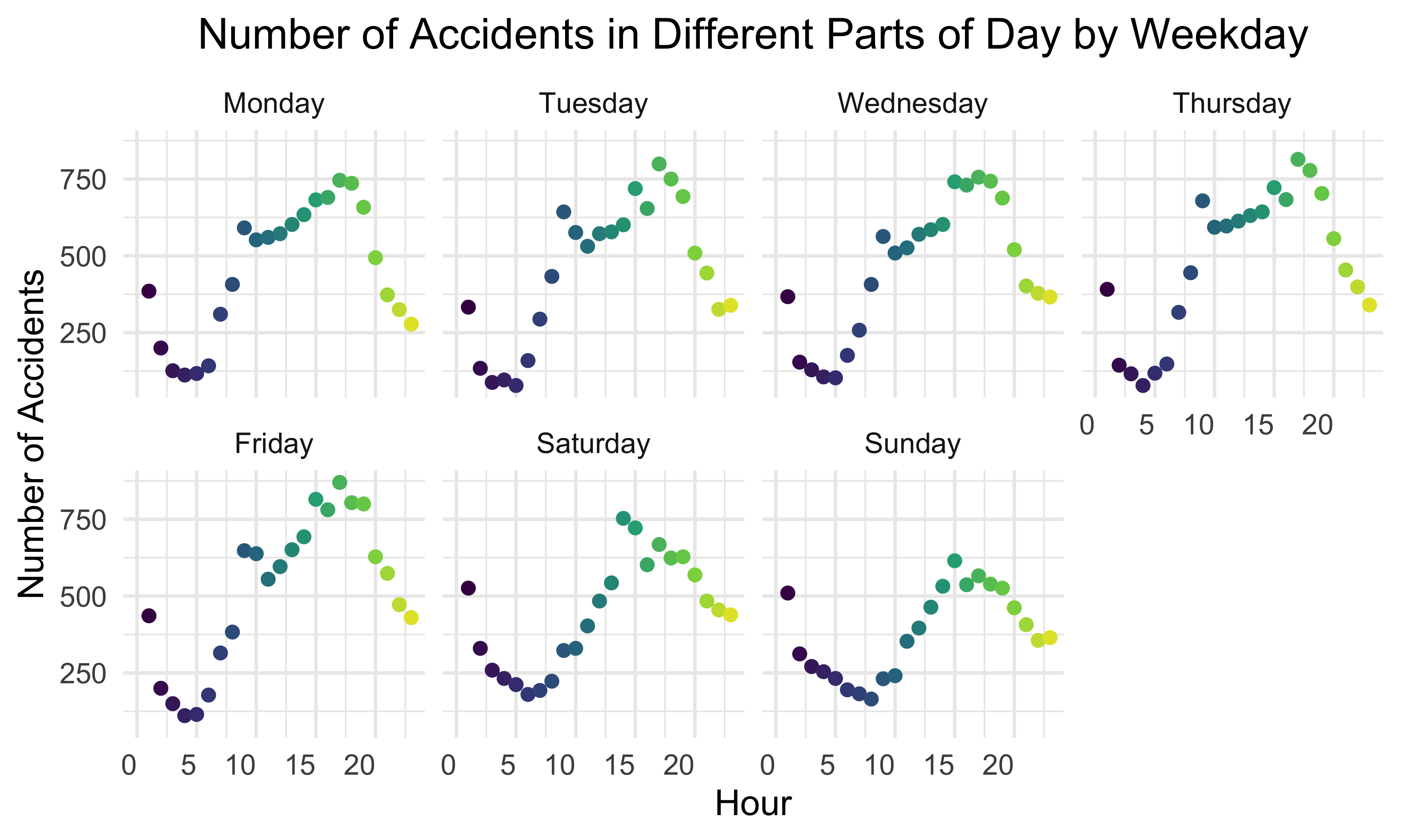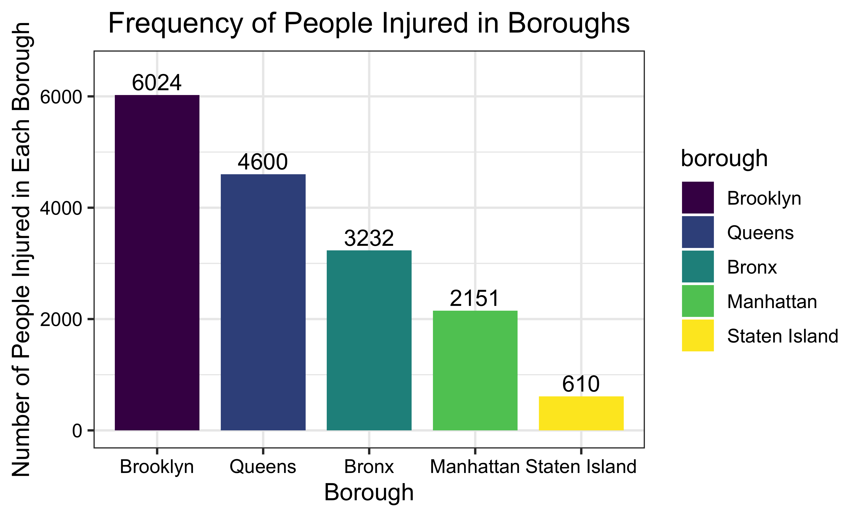For the process of data cleaning, we focused on five boroughs in NY for our analysis, and we changed the borough name from all caps to only the first letter in capital. Then we separated the crash date variable into year, month, and day, and separated the crash time variable into hour, minute, and second. Also, we releveled the month and weekday into their standard name. Furthermore, we filtered out all the missing values in the borough.