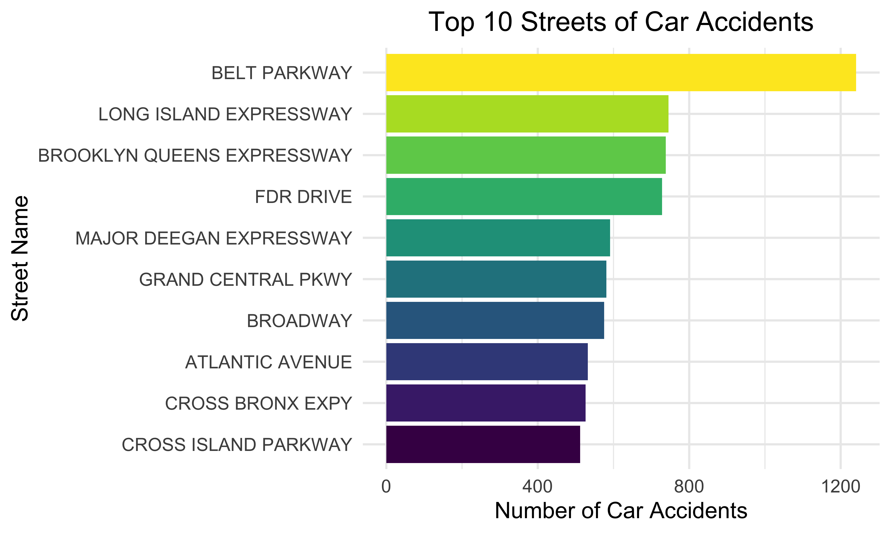 Then, we explored the streets where most car accidents have taken place. The bar graph indicates that Belt Parkway has the most car accidents. Long Island Expressway, Brooklyn Queens Expressway, and FDR Drive also have a relatively great amount of accidents.