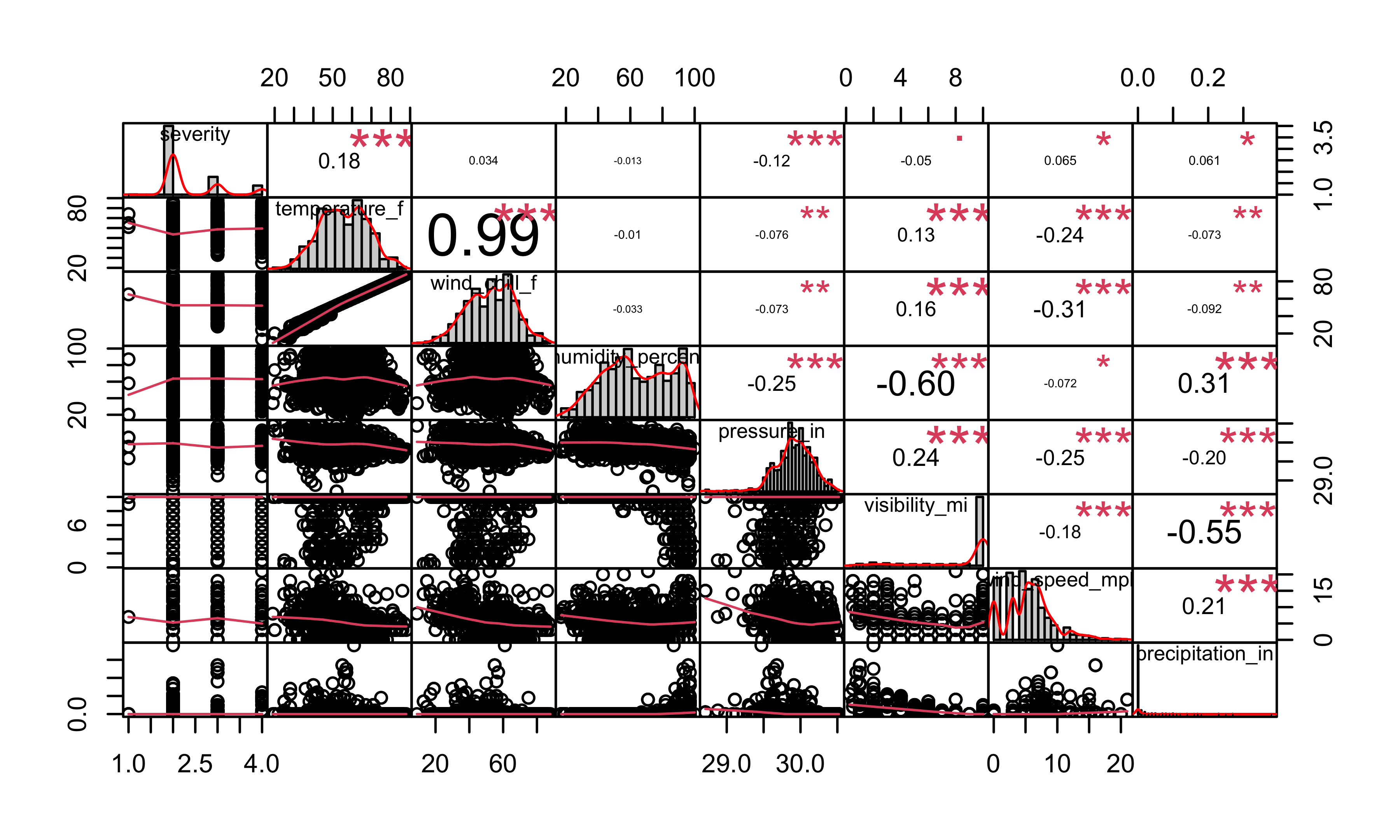 From the plot, we can see that there is a potential linear relationship between severity and weather conditions. Then, we investigate the interaction of temperature and pressure.