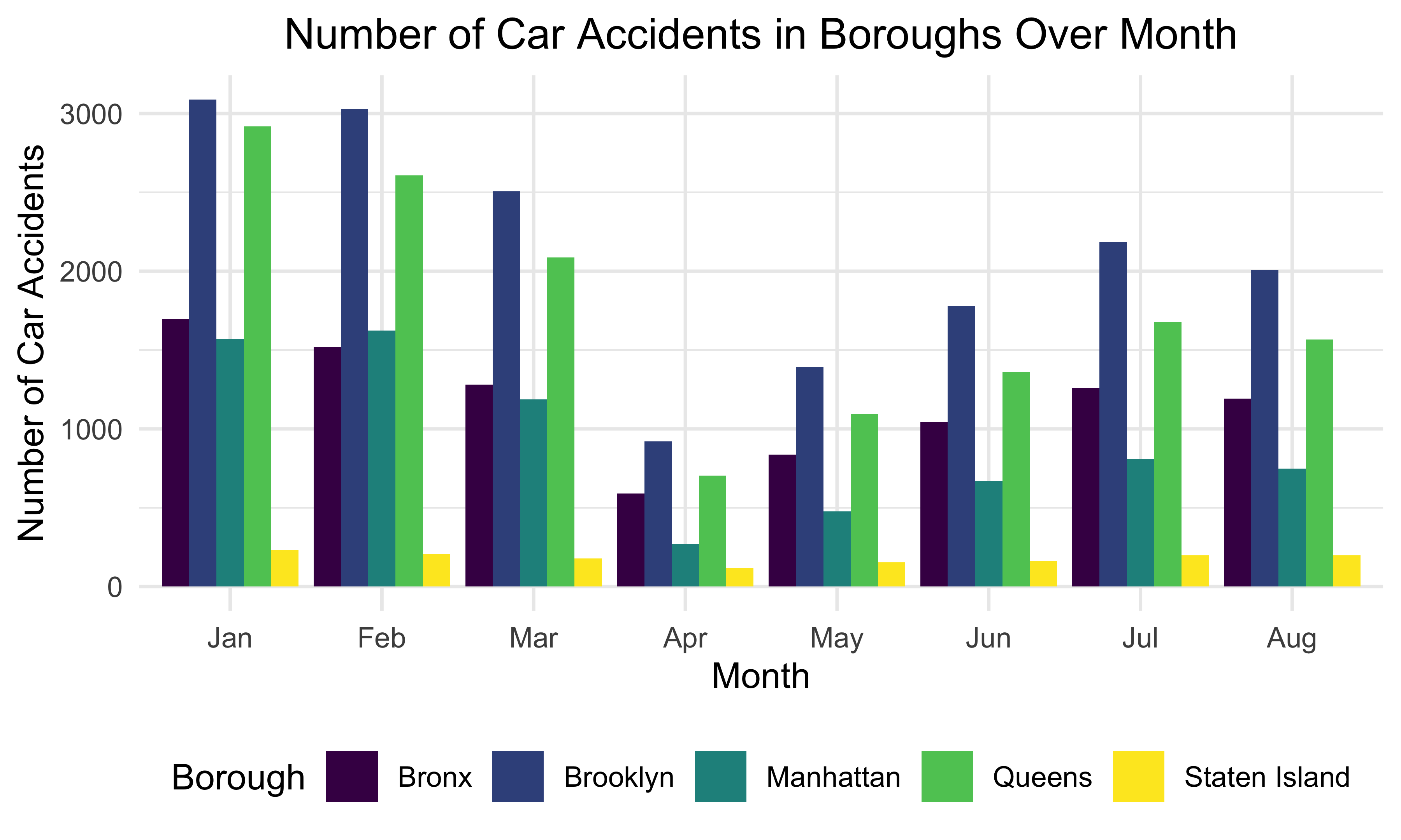 We also investigated the overall pattern of car accidents in different boroughs over months. There tend to be most car accidents in January and February while least car accidents took place in April. Overall, the number of car accidents decreases from January to April and increases from April to July. Brooklyn seems to have the most car accidents while least car accidents occurred in Staten Island over the 8 months in New York City.