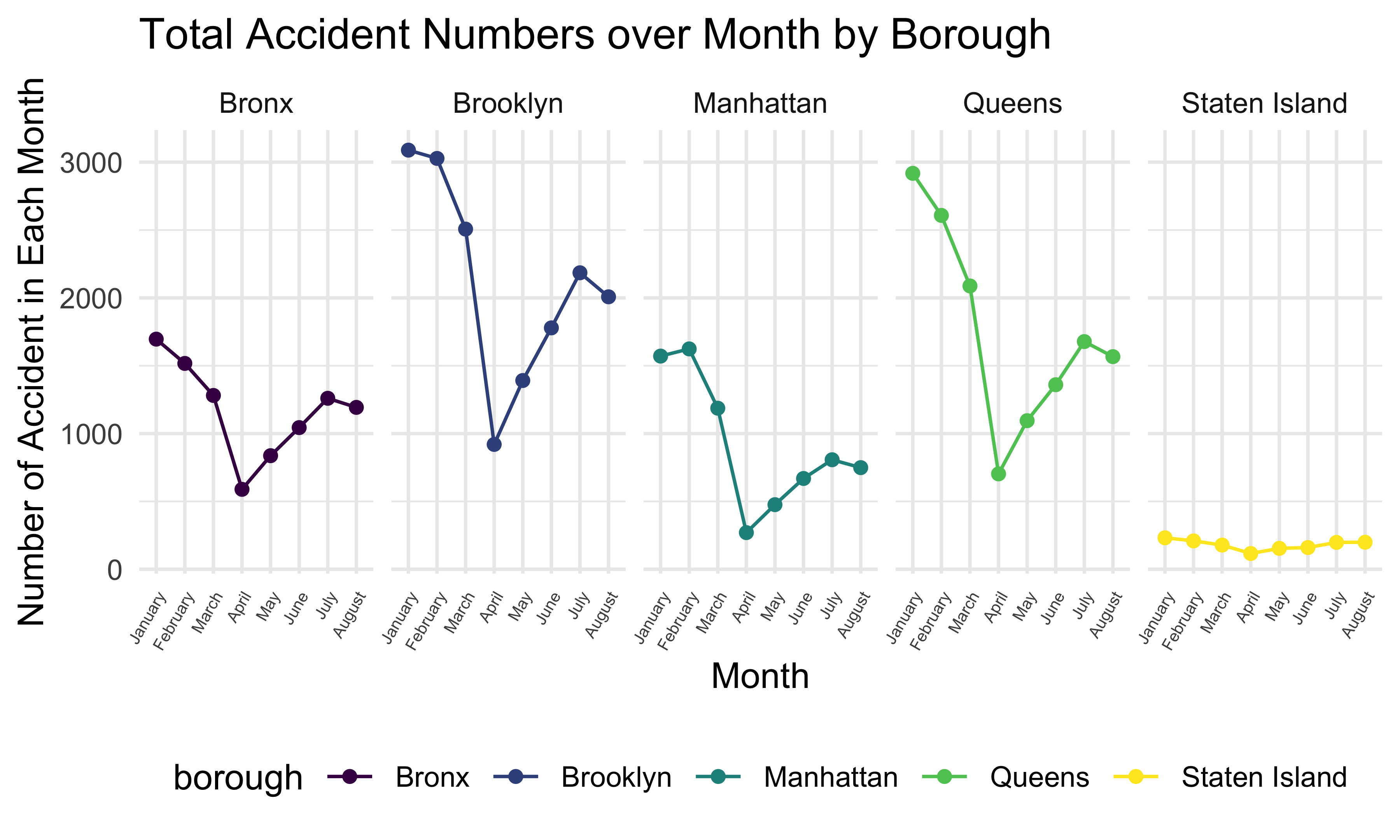 This graph shows the total number of accidents in 5 boroughs from January to August in 2020. We can see that in January, February, and March, the accident numbers in these boroughs are much higher than in other months, and the accident numbers in April are the lowest for 5 boroughs. Also, Brooklyn has the largest accident number and Staten Island has the smallest accident number among all boroughs in every month in New York.