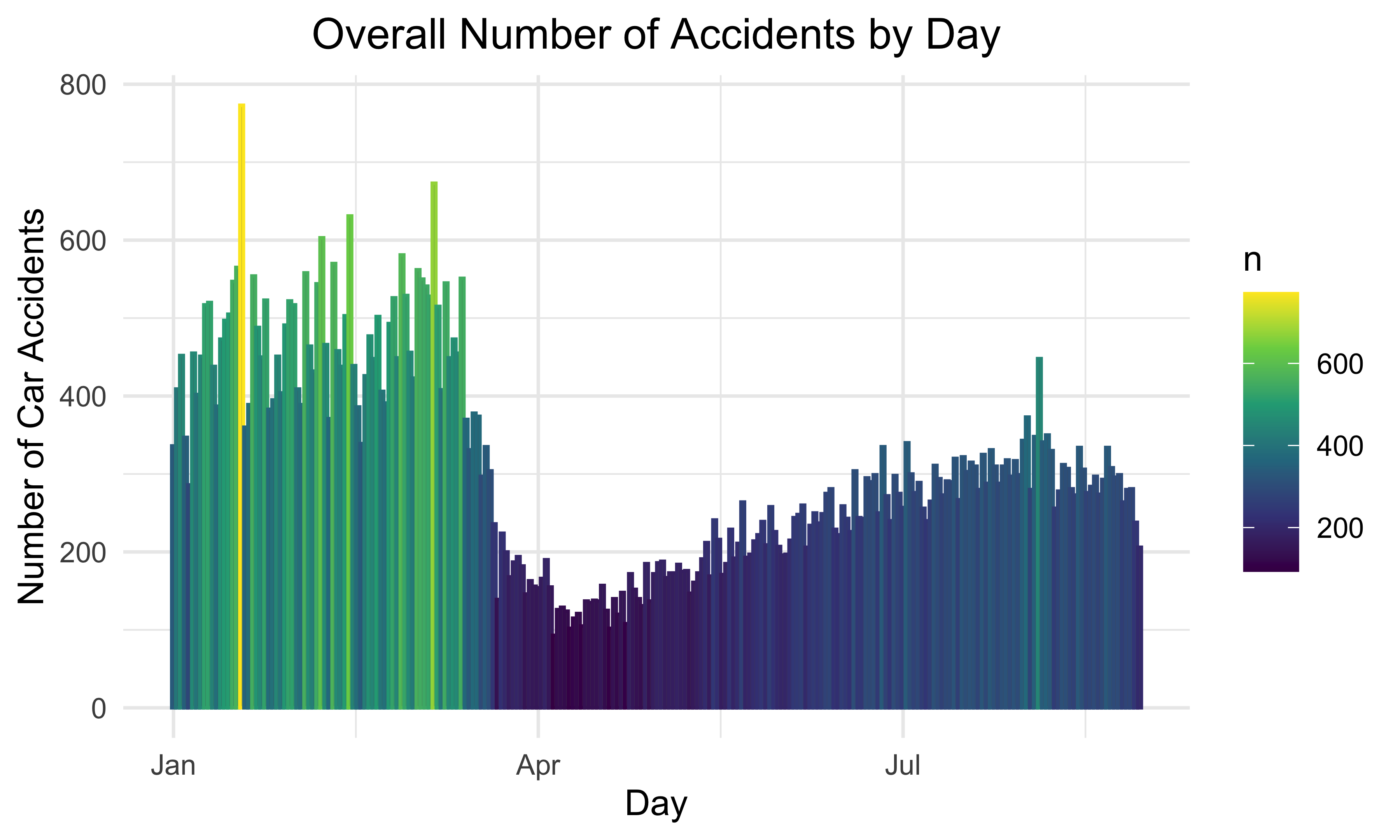 This bar plot represents the number of car accidents each day over the 8 months. Most car accidents took place from January to March. The month with the least number of car accidents is April. This graph also matches the pattern demonstrated by the previous plot.
