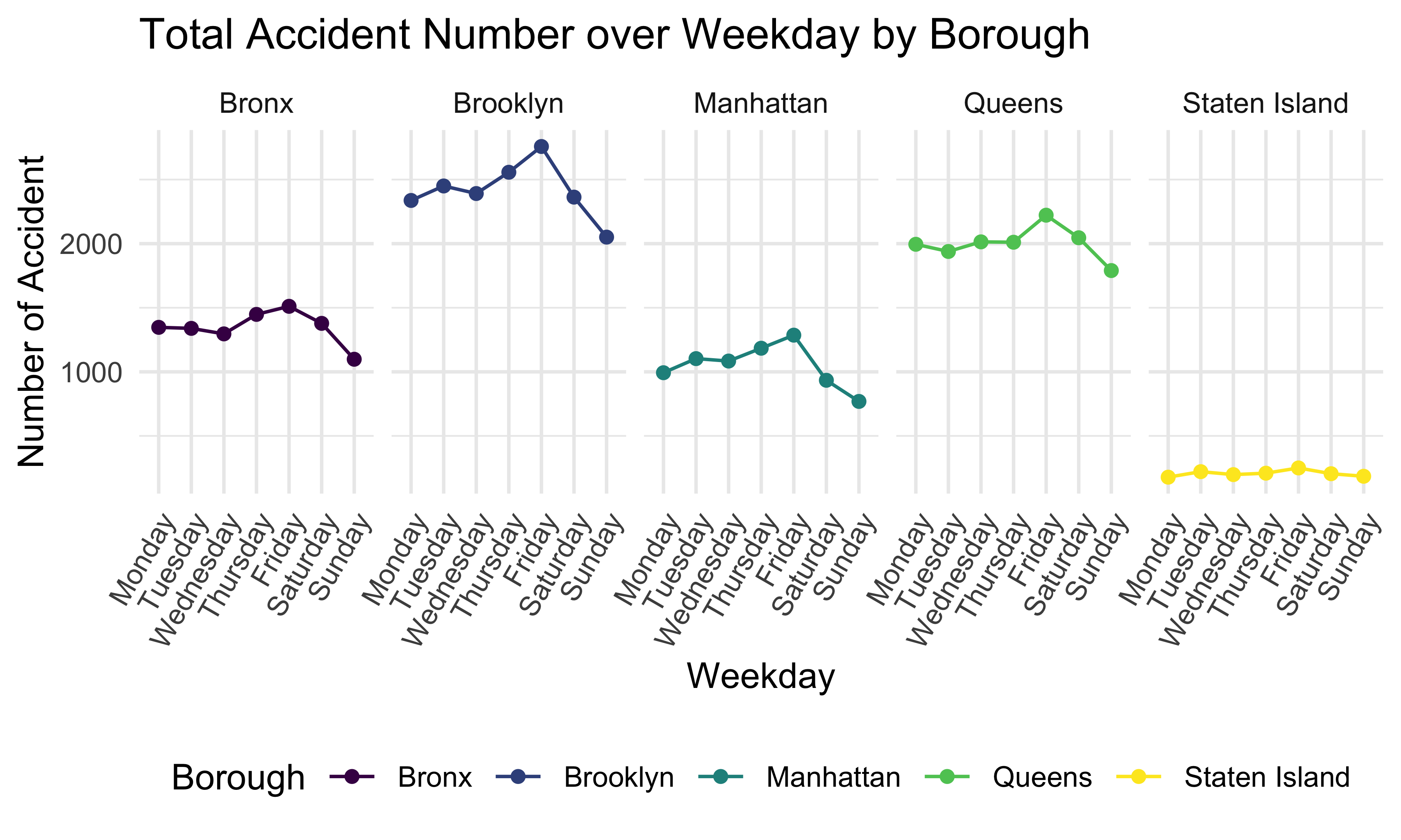 Next, this plot shows the total accident number over weekday by borough. We can tell that 5 boroughs have a similar trend, and the accident number is the highest on Friday and lowest on Sunday. Brooklyn has the highest daily accident number and Staten Island has the lowest in 5 boroughs.