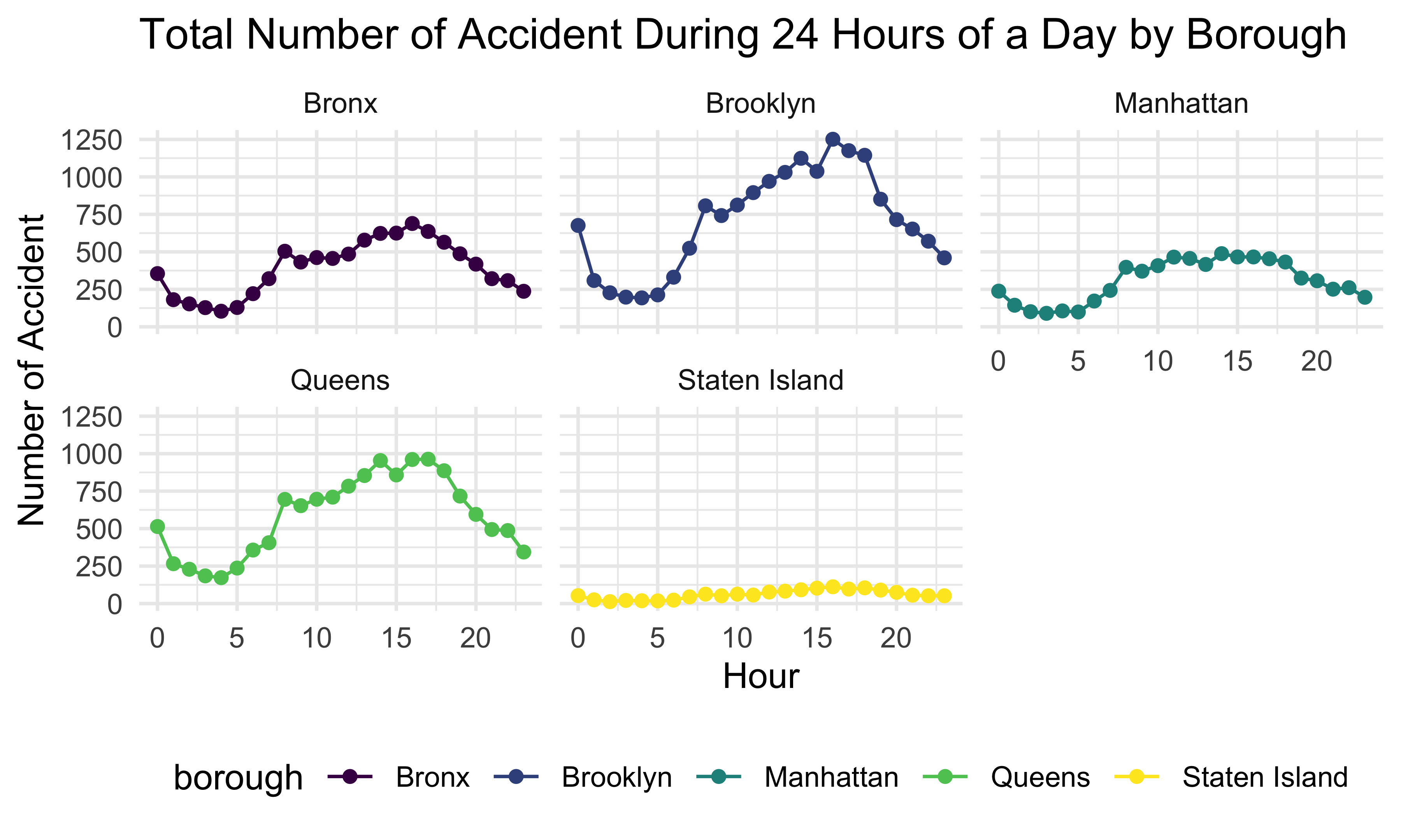 This plot shows the total accident number during 24 hours of a day by borough. We can see that 5 boroughs have a similar daily trend. The number of accidents is relatively low from 12:00 am to 6:00 am, then increases and keeps high from 8:00 am to 5:00 pm, and drops until 12:00 am.